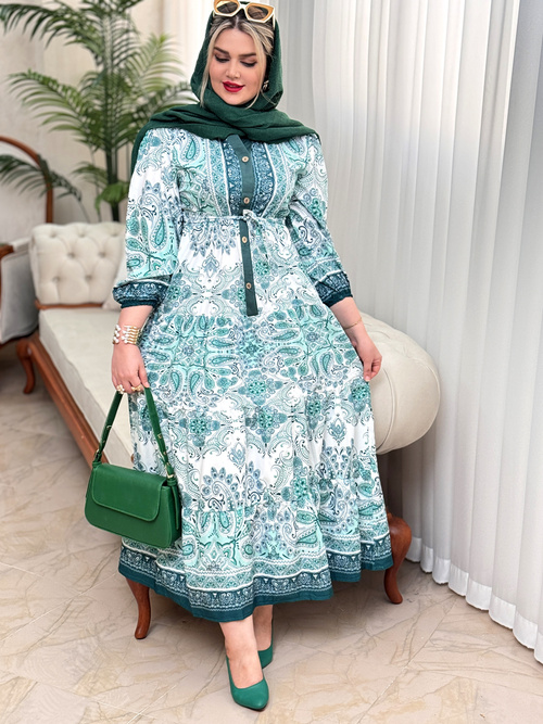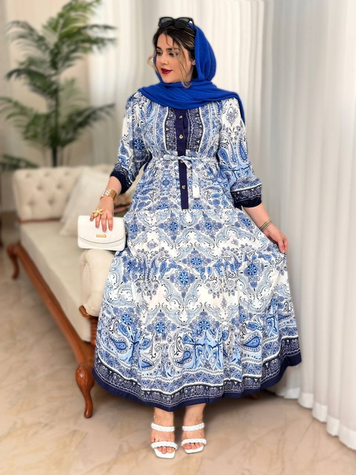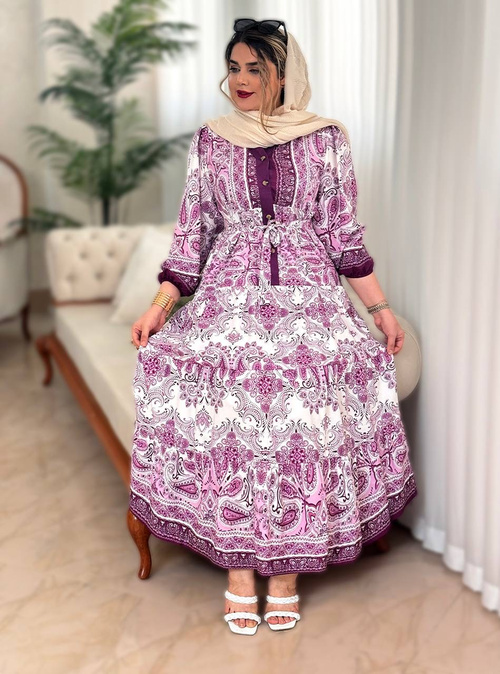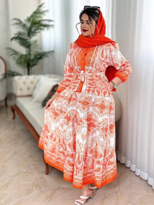 یک پیراهن مرونی فوق العاده زیبا با تنخور قشنگی که از 38 تا 46 میشه یک کمربند از جنس خود کار داره که تو تن فیت میشه جنسش عالیه بدون چروک و آبرفته قدش 131دورسینه 110 دوربازو 46دور باسن 160