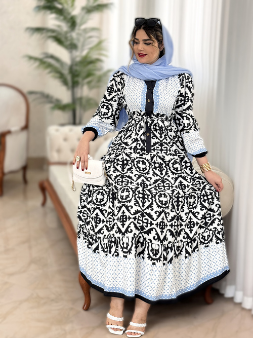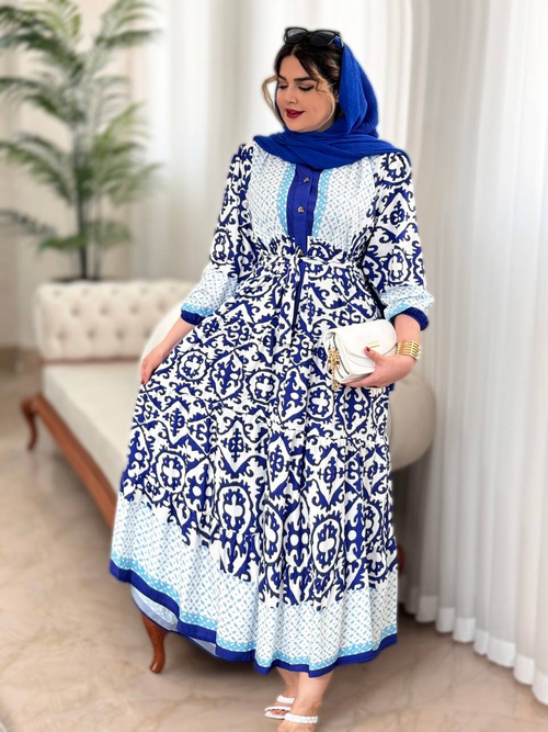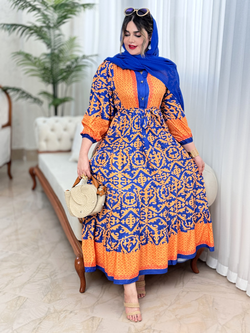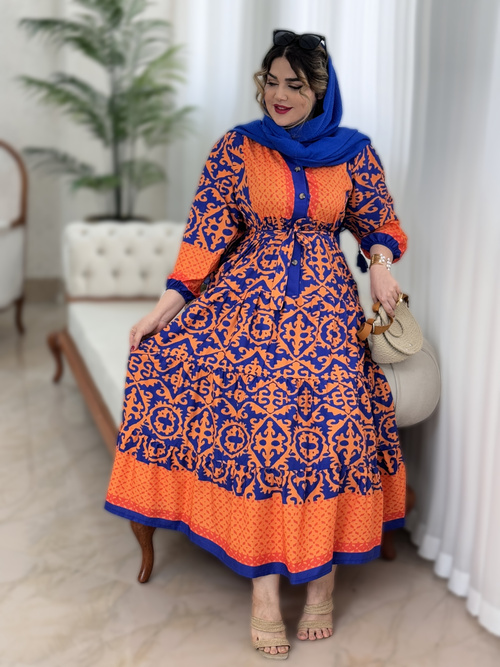 یک پیراهن مرونی فوق العاده زیبا با تنخور قشنگی که از 38 تا 46 میشه یک کمربند از جنس خود کار داره که تو تن فیت میشه جنسش عالیه بدون چروک و آبرفته قدش 129دورسینه 110 دوربازو 46دور باسن