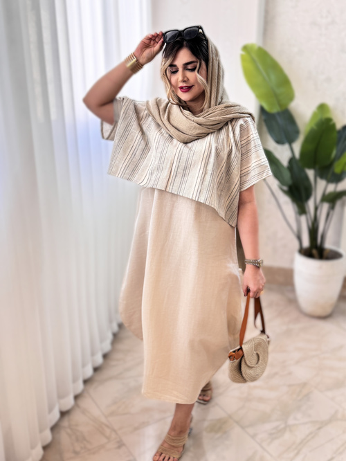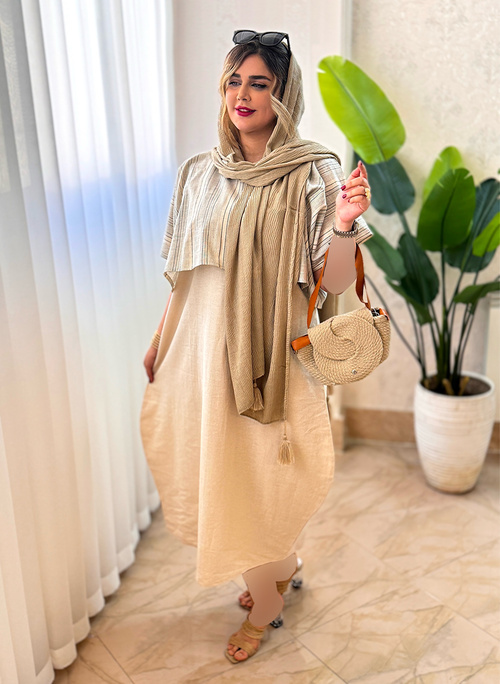 ?جنس کار: لینن?قد رویه: 46?قد سارافون: 125cm?دورسینه: 110cm?دوربازو: 42cm?قد آستین از سرشانه: 55cm