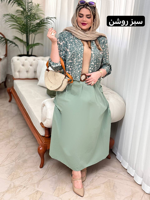 جنس کت کرپ فلور دامن لیننفری‌سایز: 38 تا 44قد دامن 94 دورباسن 140 دورکمردرحالت کشسانی 100قد کت: 50 دورسینه: 108