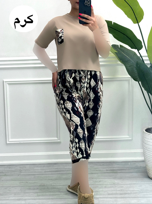 فری سایز 38 تا 42 جنس شلوار نخی جنس بلوز نخ پنبه قد بلوز 45 دور سینه 102 شلوار کمر در حالت کشسانی 116 قد شلوار 76